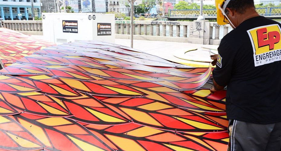 Às vésperas de colocar dois milhões de foliões nas ruas do Recife, o Galo gigante começa a ganhar forma sobre a ponte Duarte Coelho, no bairro da Boa Vista, na área central da Capital, nesta quinta-feira (8). A estrutura de ferro se junta às peças de revestimento, que chegaram no início da manhã. A montagem é de responsabilidade do iluminador e cenógrafo Edson Lira. O Galo terá 25 metros de altura e pesa 3,5 toneladas com tons em amarelo, vermelho, verde e laranja. No total, serão usadas 700 penas de PVC expandido, de tamanhos entre 60 centímetros e 4 metros, adesivadas com padronagens criadas especialmente para o Galo pelo designer Walther Holmes.